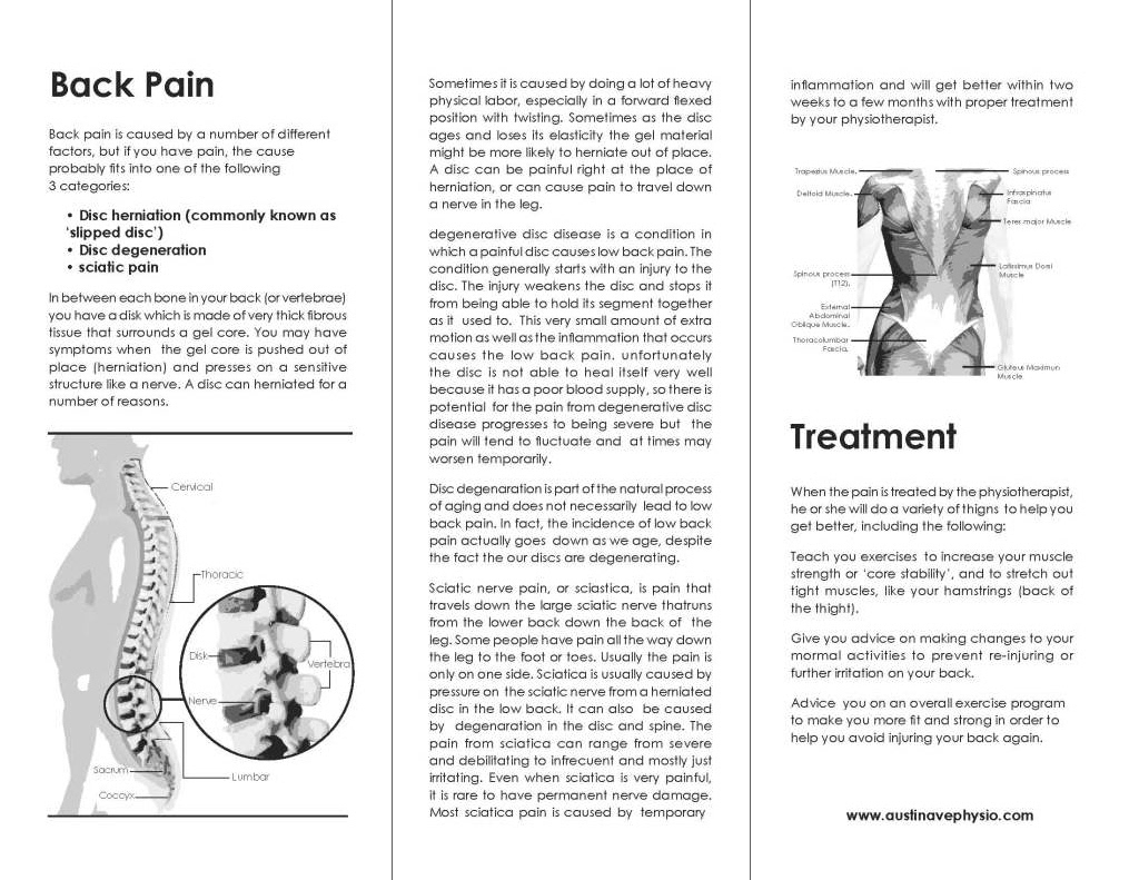 An informative brochure for patients with back problems. Requested as; one ink, Tri-fold brochure easy to print In-House